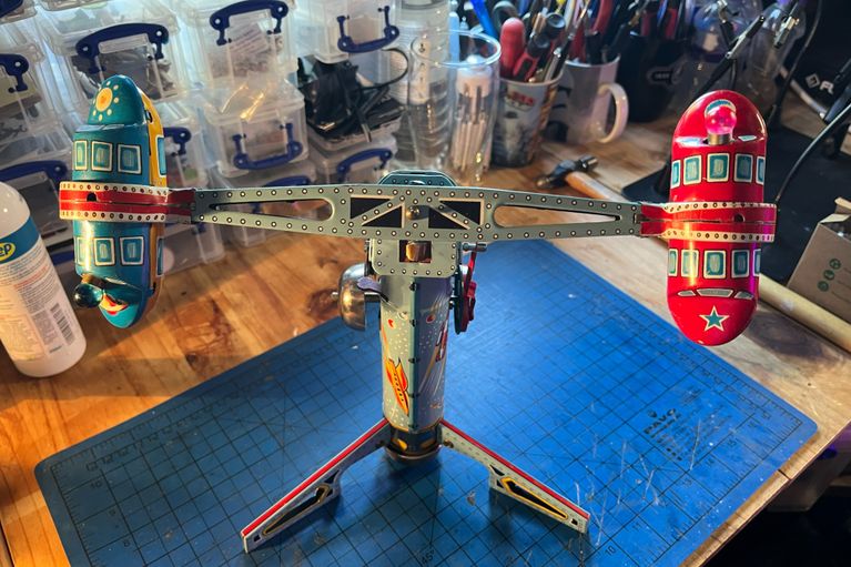 Vintage Twirly Whirly rocket car tin plate toy. This piece came to us from the Amsterdam Toy Museum. On inspection the drive mechanism failed to work, the wiring had broken away from the rotating arm, the drive belt was slipping and the bulbs failed to operate. A service of the motor and cog work got the drive mechansim operating again, we replaced the drive belt with a new one, cleaned all of the electrical contacts and resoldered the wiring to the rotating arm and lighting. Finally the piece was given a clean and is now fully working once more. Its great to know that this item can be returned to the museum where it will be exhibited once more for people to enjoy.